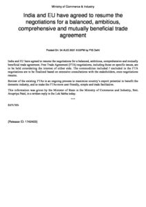 India and EU have agreed to resume negotiation fro balance, ambitious trade agreements